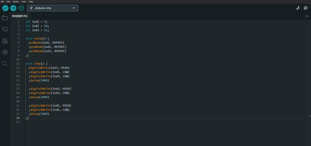 Ik moest in arduino een stoplicht coderen en dat sturen naar de moederboord. We kregen een blaadje waar de codes opstonden en dat moesten we invullen daarna moesten we ook zelf codes bedenken.